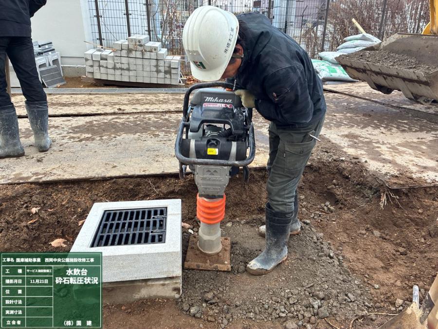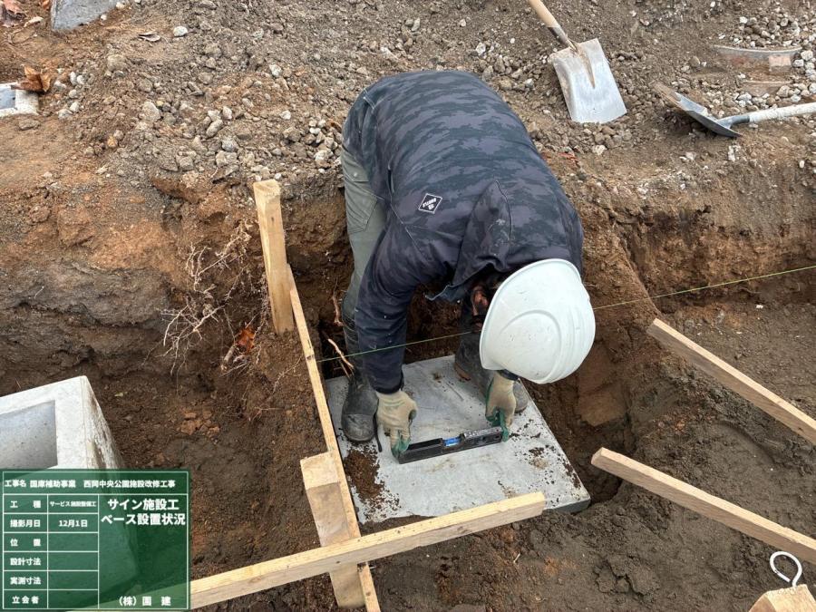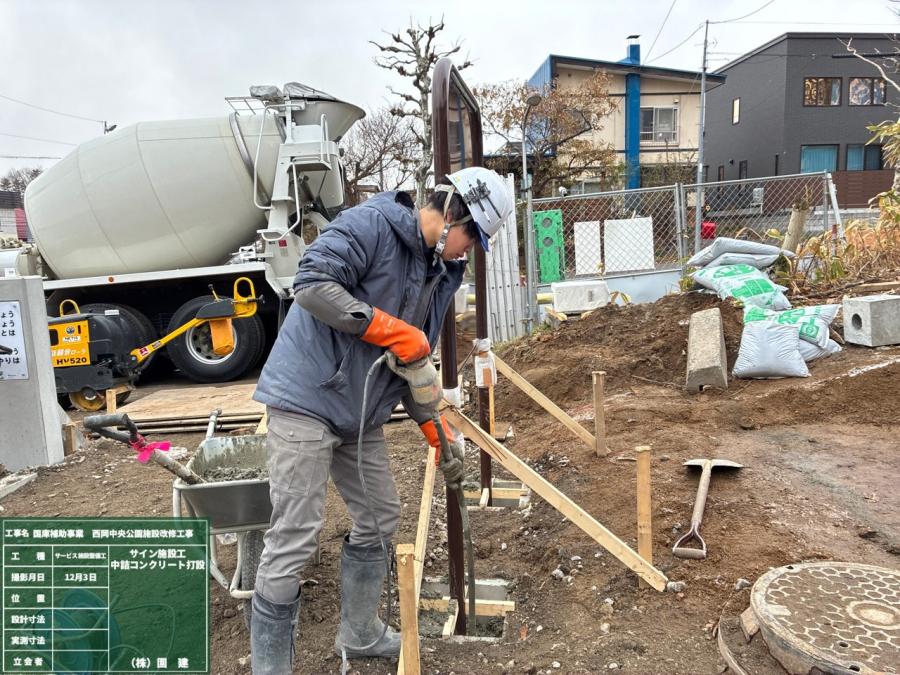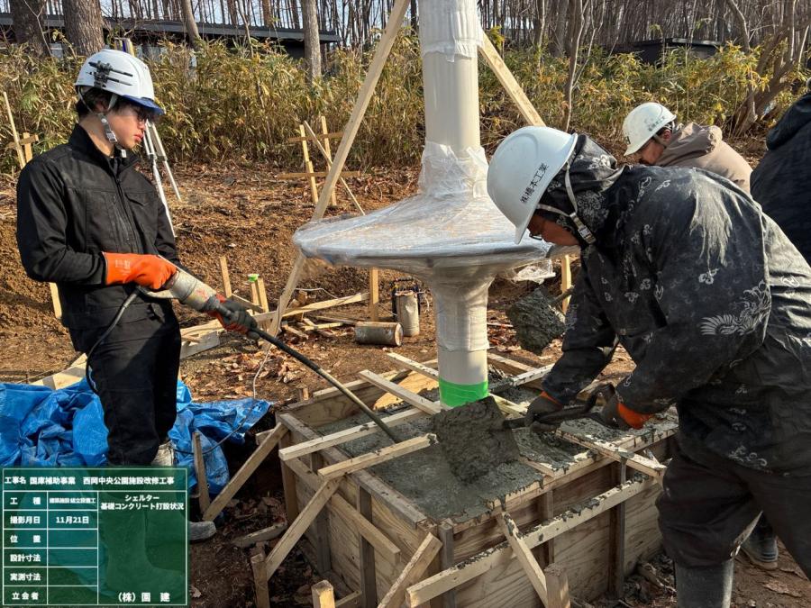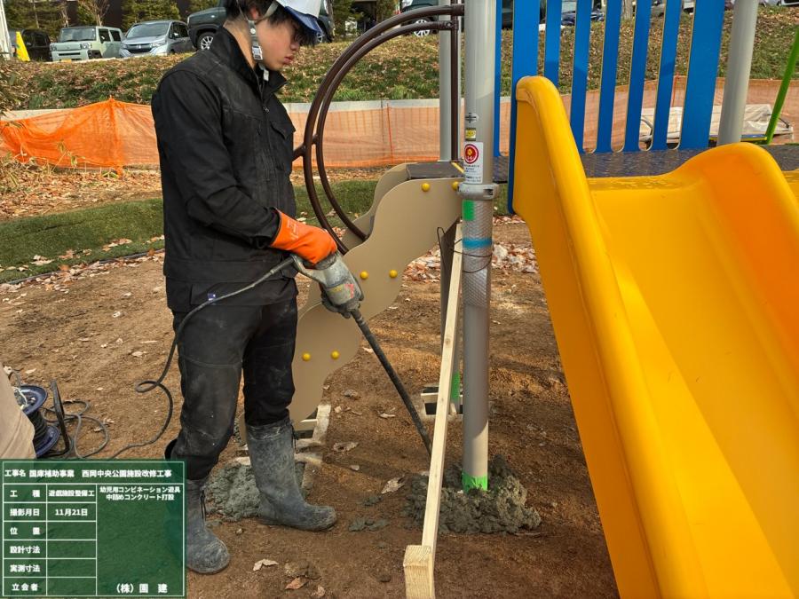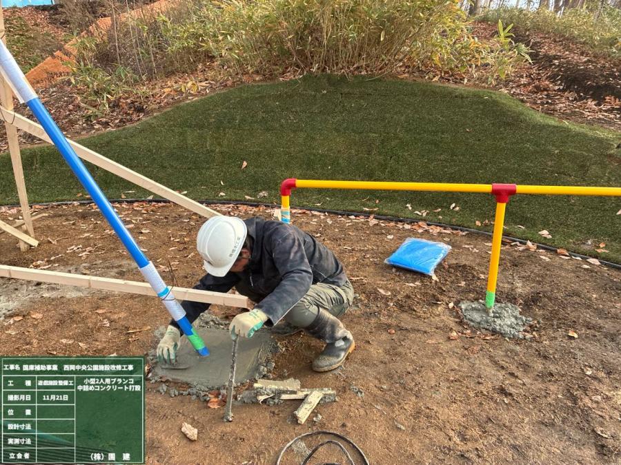 遊具などの基礎と支柱のすき間を、コンクリートでしっかりと埋め固めました。