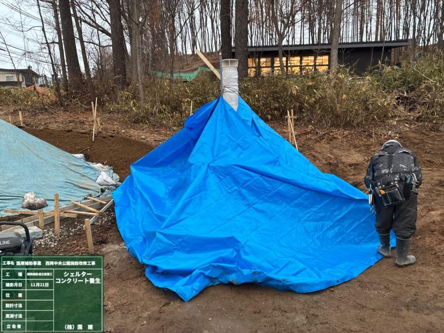 その後、ブルーシートで覆って養生し、しっかり固まるようにしています。