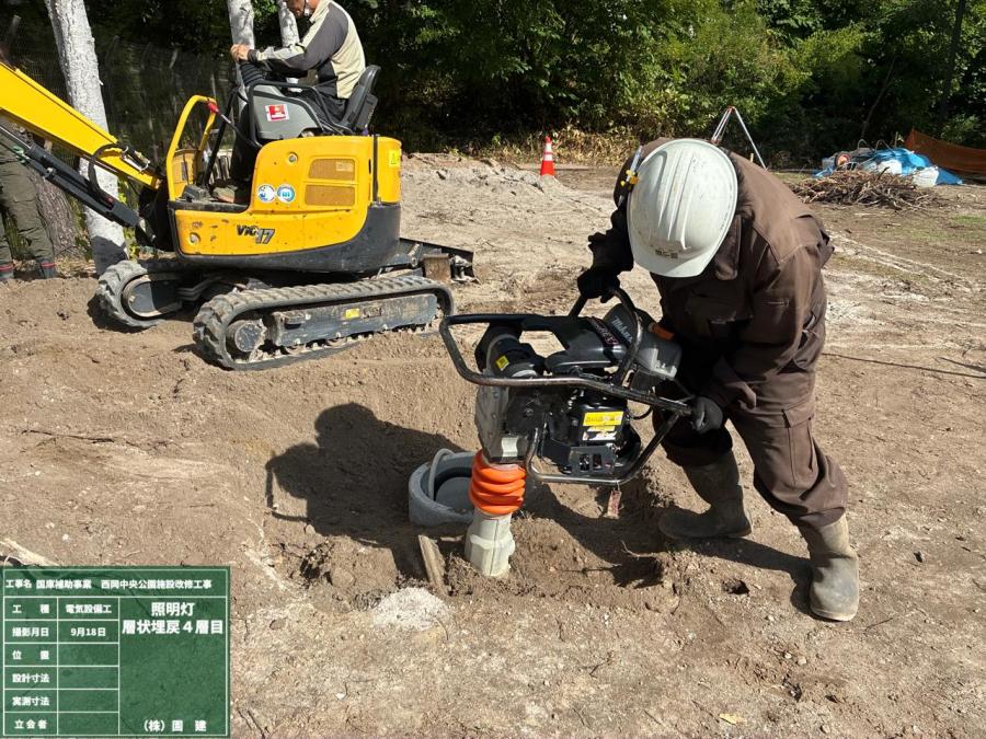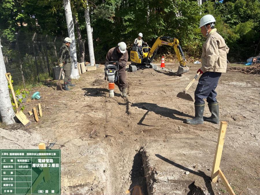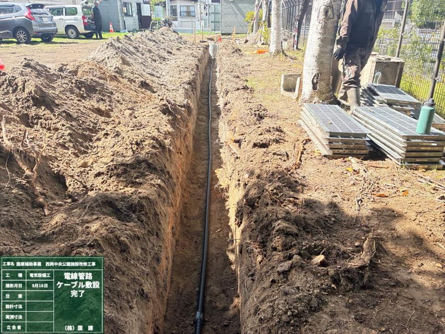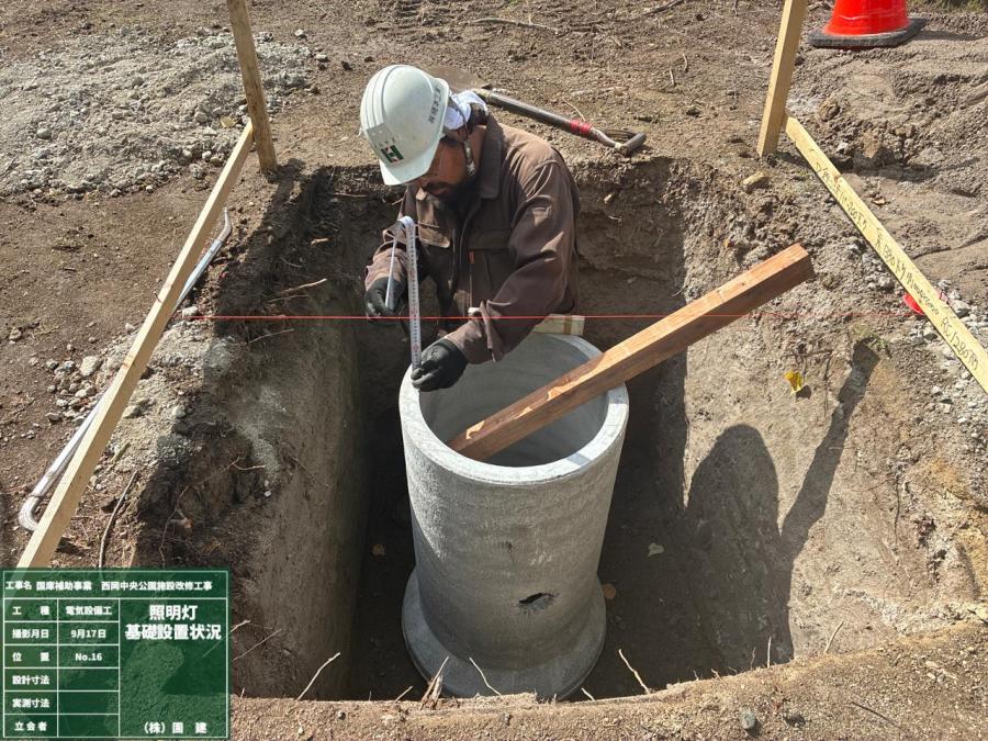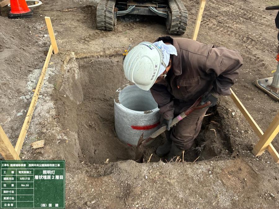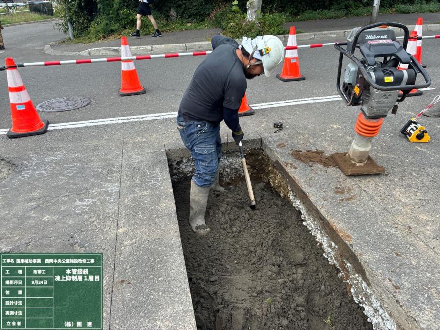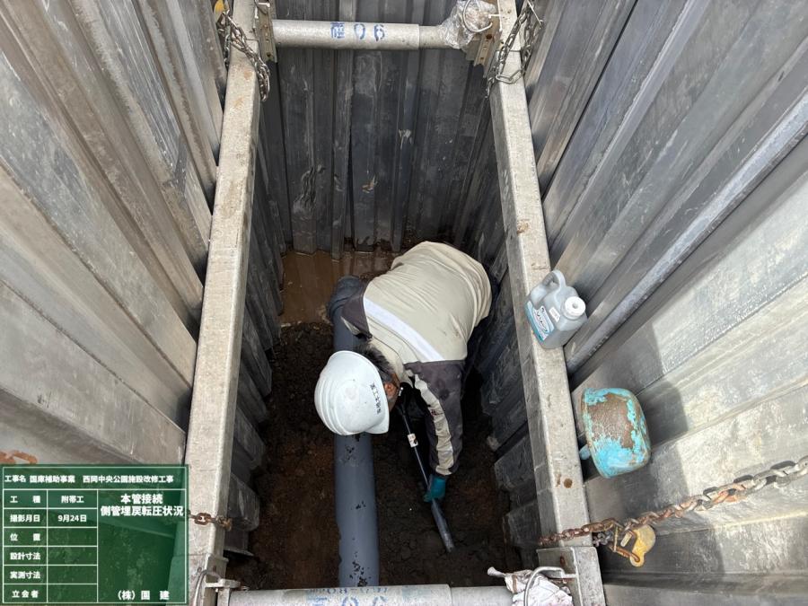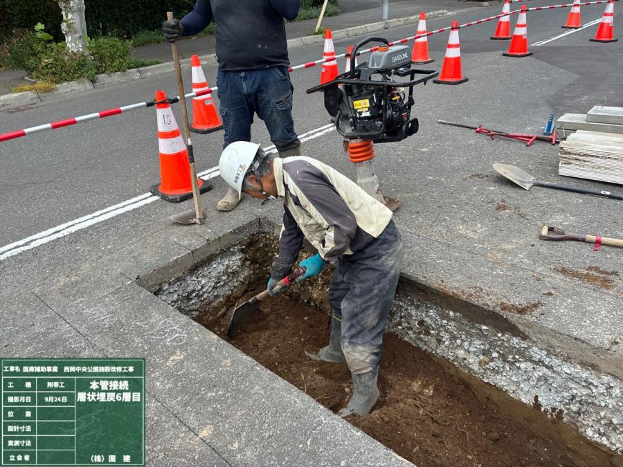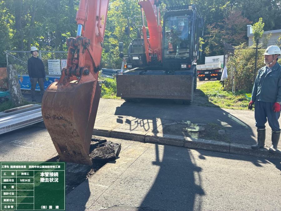 公園施設内に新設する汚水桝と、車道の地下に既に設置されていた汚水本管とを接続する工事を行いました。