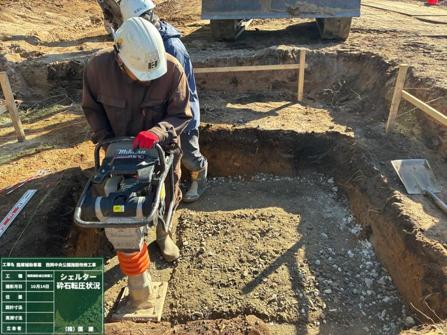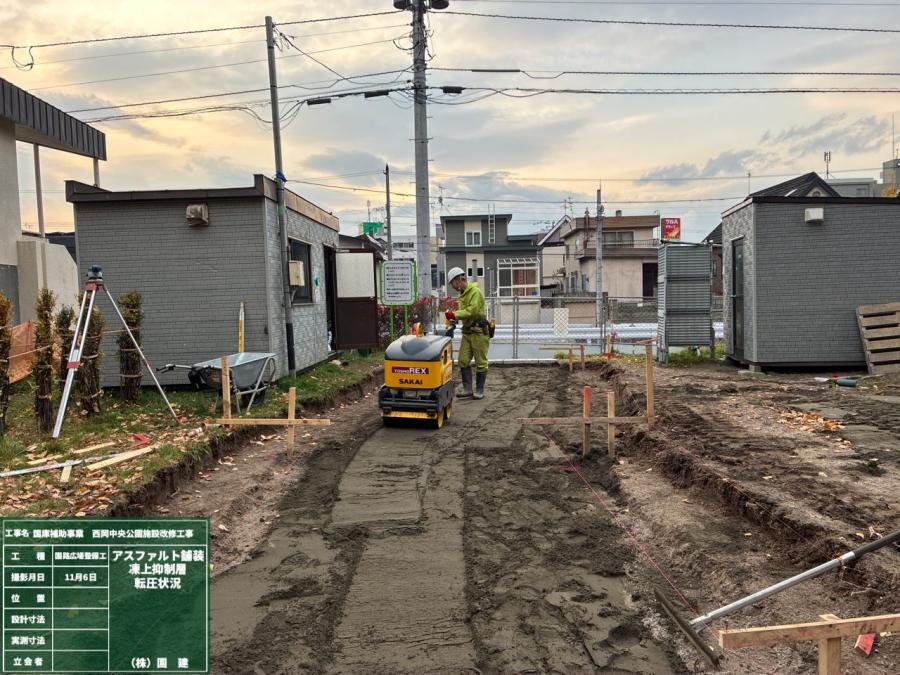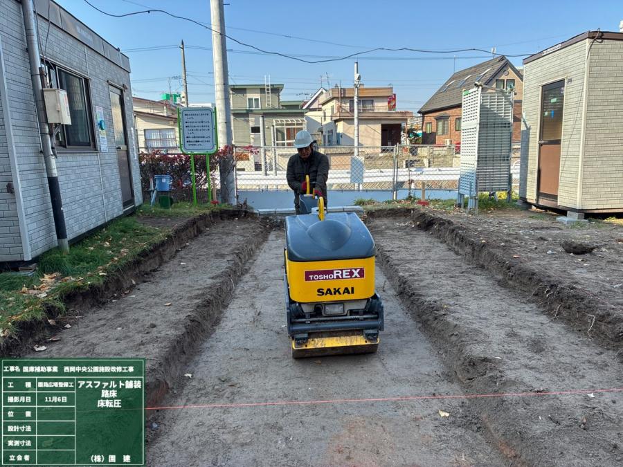 これからアスファルトの道を作る予定の地面を平らに整え、丈夫にしました。