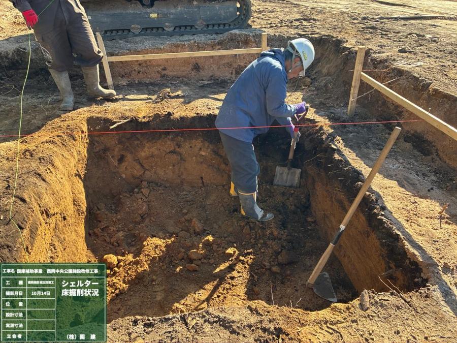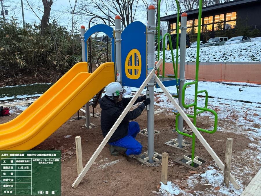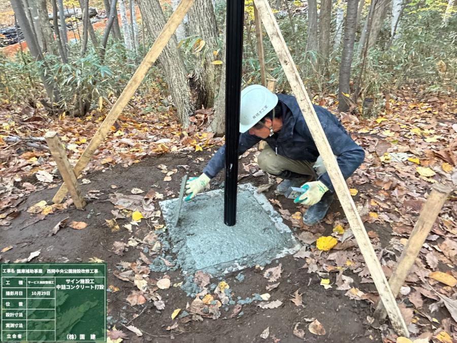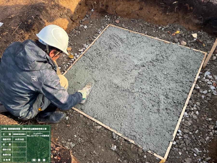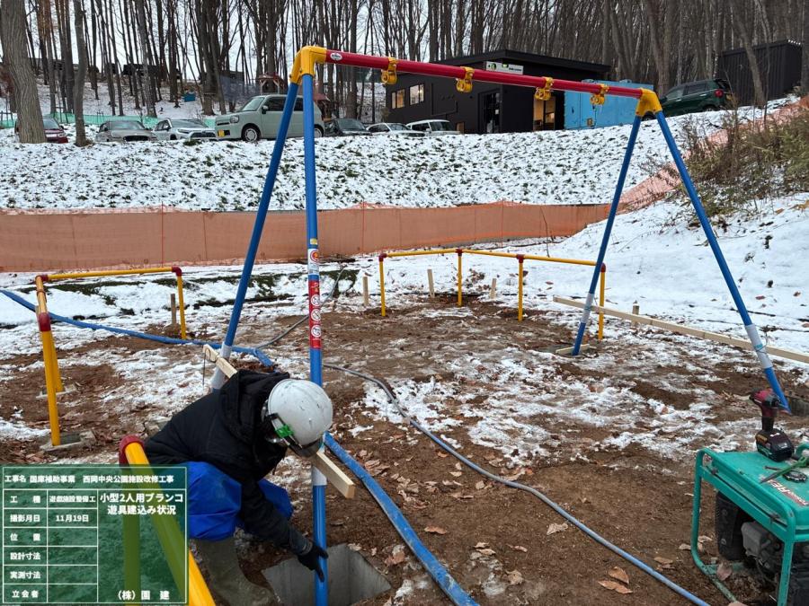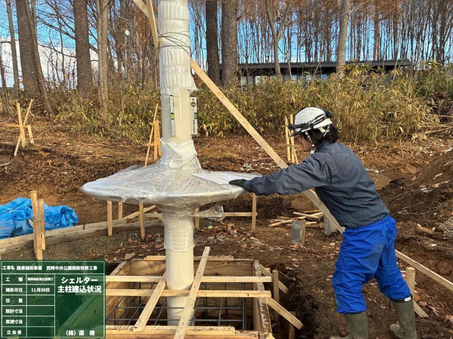遊具広場に設置する休憩用シェルターの基礎を施工し、主柱を設置しました。