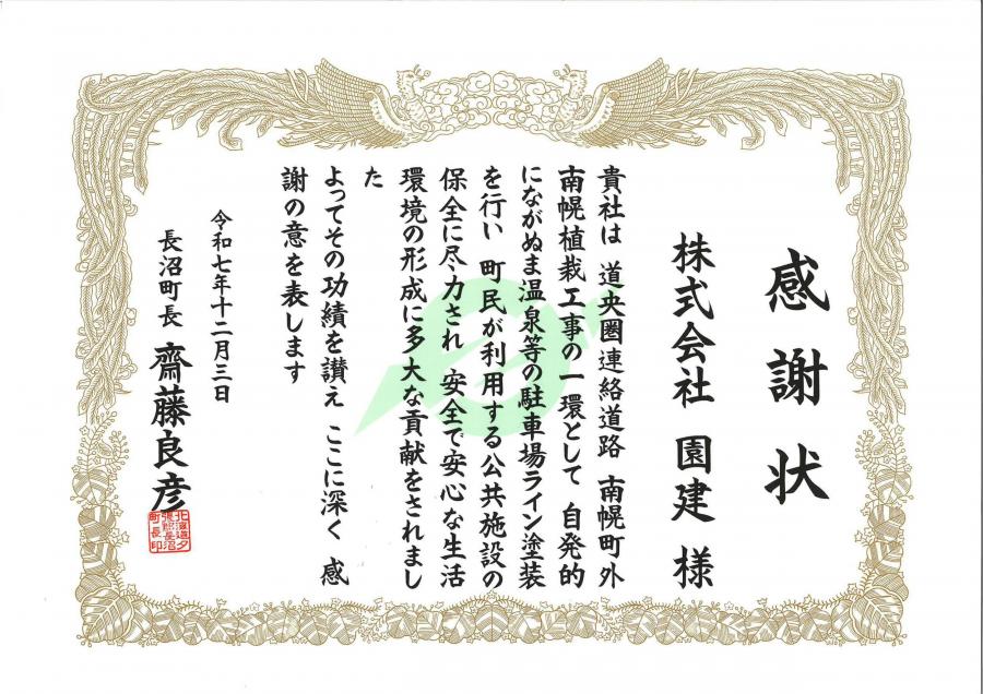 このたび、南幌植栽工事の一環として実施した「ながぬま温泉等の駐車場サイン塗装」に対し、長沼町長様より感謝状をいただきました。今後も、地域の皆さまや関係機関との連携を大切にし、安心・安全な環境づくりに努めてまいります。