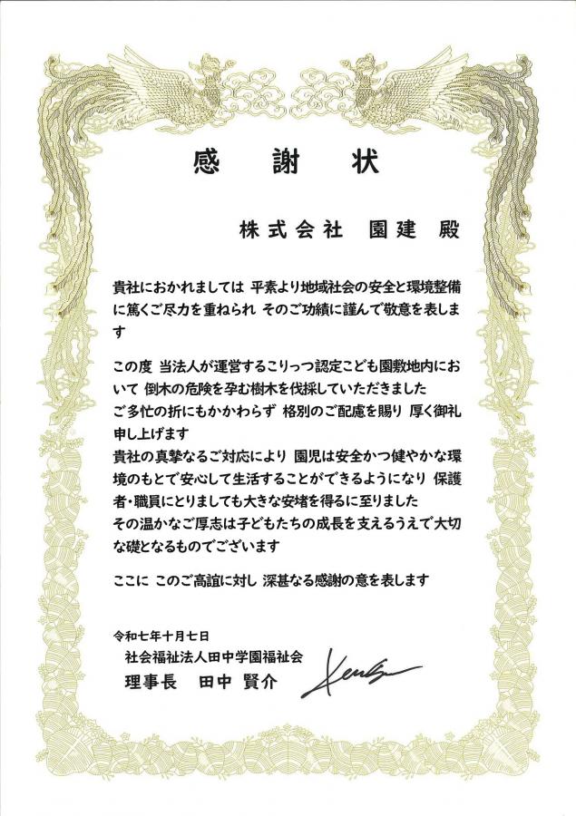 このたび、こりっつ認定こども園の敷地内において樹木の伐採作業を行ったことに対し、社会福祉法人田中学園福祉会様より感謝状をいただきました。今後も地域の皆さまや関係機関との連携を大切にし、安心・安全な環境づくりに努めてまいります。